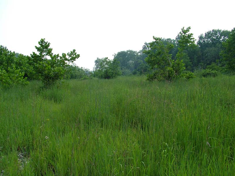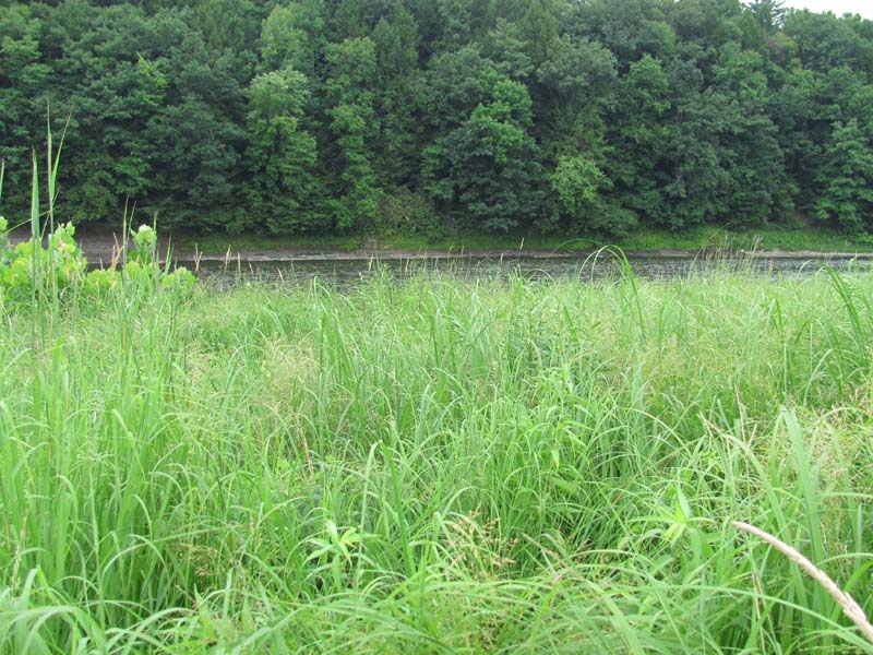This community is characterized by a dense graminoid layer with scattered short shrubs (less than 25% cover). Scattered shrubs and trees may be present, including sycamore (Platanus occidentalis), silver maple (Acer saccharinum), black willow (Salix nigra), steeplebush (Spiraea tomentosa), ninebark (Physocarpus opulifolius), and silky dogwood (Cornus amomum), but the community is predominantly composed of warm season grasses: big bluestem (Andropogon gerardii), switchgrass (Panicum virgatum), and Indian-grass (Sorghastrum nutans). Associate species include cordgrass (Spartina pectinata), water-pepper (Persicaria punctata), tearthumb (Persicaria sagittata), hedge bindweed (Calystegia sepium), rice cutgrass (Leersia oryzoides), purple-leaved willow-herb (Epilobium coloratum), Indian-hemp (Apocynum cannabinum), beggar-ticks (Bidens spp.), false nettle (Boehmeria cylindrica), jewelweed (Impatiens capensis), bugleweed (Lycopus uniflorus), late goldenrod (Solidago gigantea), wrinkle-leaf goldenrod (Solidago rugosa), grass-leaved goldenrod (Euthamia graminifolia), wild mint (Mentha arvensis), boneset (Eupatorium perfoliatum), Joe-Pye-weed (Eutrochium fistulosum), ox-eye (Heliopsis helianthoides), tall tickseed (Coreopsis tripteris), flowering spurge (Euphorbia corollata) flat-topped white aster (Doellingeria umbellata), calico aster (Symphyotrichum lateriflorum), twisted sedge (Carex torta), riverbank wild-rye (Elymus riparius), blue false-indigo (Baptisia australis), deer-tongue grass (Dichanthelium clandestinum), and common yellow wood-sorrel (Oxalis stricta). Reed canary-grass (Phalaris arundinacea), which is often present in this type, represents a significant threat as it can form large single species colonies.