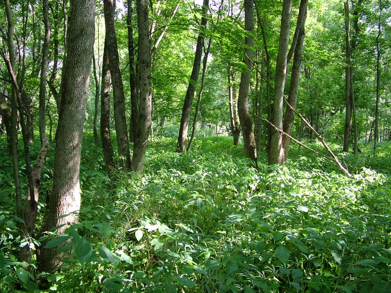 The canopy of this community is dominated by green ash (Fraxinus pennsylvanica) and may contain one or more other hardwood species as sub-dominants, including black walnut (Juglans nigra) and sycamore (Platanus occidentalis). Other less common canopy species include American elm (Ulmus americana), hackberry (Celtis occidentalis), red maple (Acer rubrum), silver maple (Acer saccharinum), and pin oak (Quercus palustris). The subcanopy and shrub layers are often sparse (occasionally dense at some sites) and are characterized by regeneration of canopy tree species and some shrub species such as spicebush (Lindera benzoin). Where exotic species are not rampant, the herbaceous layer is characterized by jewelweed (Impatiens spp.), wood nettle (Laportea canadensis), wingstem (Verbesina alternifolia), Canadian waterleaf (Hydrophyllum canadense), poison ivy (Toxicodendron radicans), and Virginia creeper (Parthenocissus quinquefolia). A number of examples of this community have been heavily impacted by exotic herbaceous species, which may attain a total cover in excess of 90 percent. Common exotic species include multiflora rose (Rosa multiflora), Morrow’s honeysuckle (Lonicera morrowii), common privet (Ligustrum vulgare), Japanese barberry (Berberis thunbergii), Japanese stiltgrass (Microstegium vimineum), Japanese knotweed (Fallopia japonica), dame’s-rocket (Hesperis matronalis), gill-over-the-ground (Glechoma hederacea), and garlic-mustard (Alliaria petiolata).